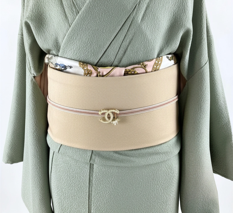 【①ブランドのスカーフを使ったエレガント個性派帯揚げ】