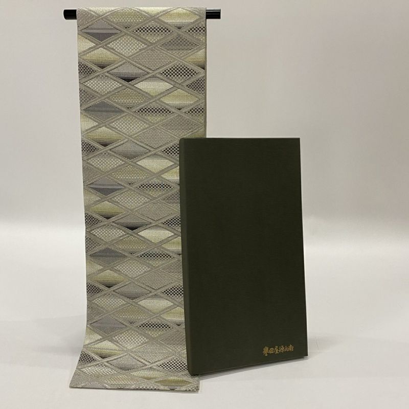 ↓袋帯 美品 逸品 誉田屋源兵衛 共箱付き 金華燦綴 鈴乃屋 菱 市松 箔 輪奈織 銀色 六通 正絹↓