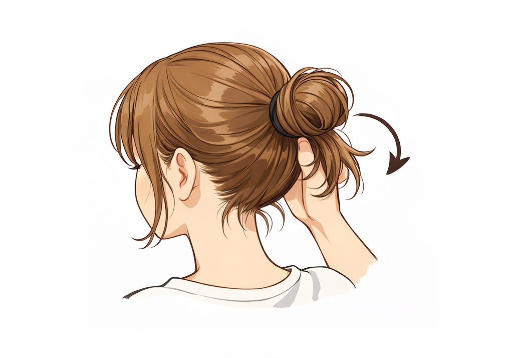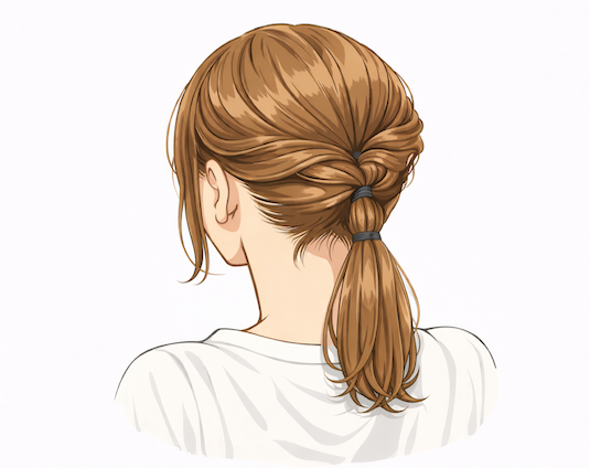 - 耳の高さより少し低めの位置で髪の毛を結び、結びきらないお団子でストップさせる。
