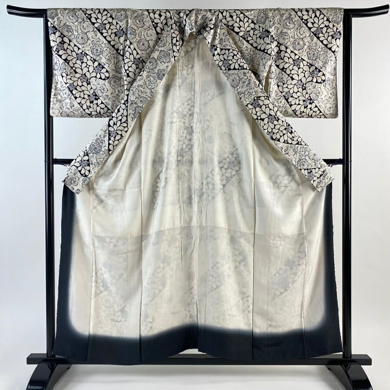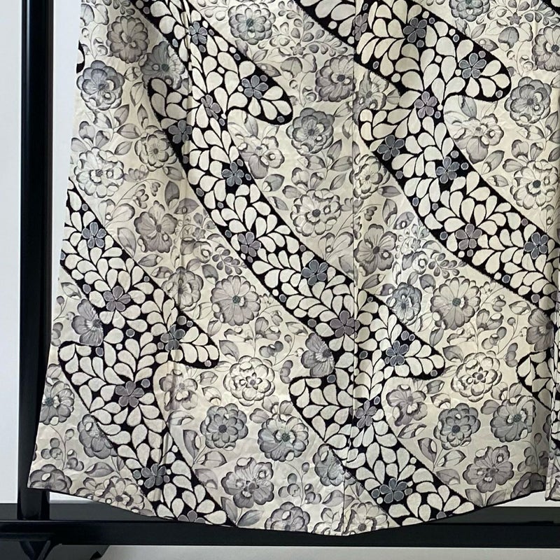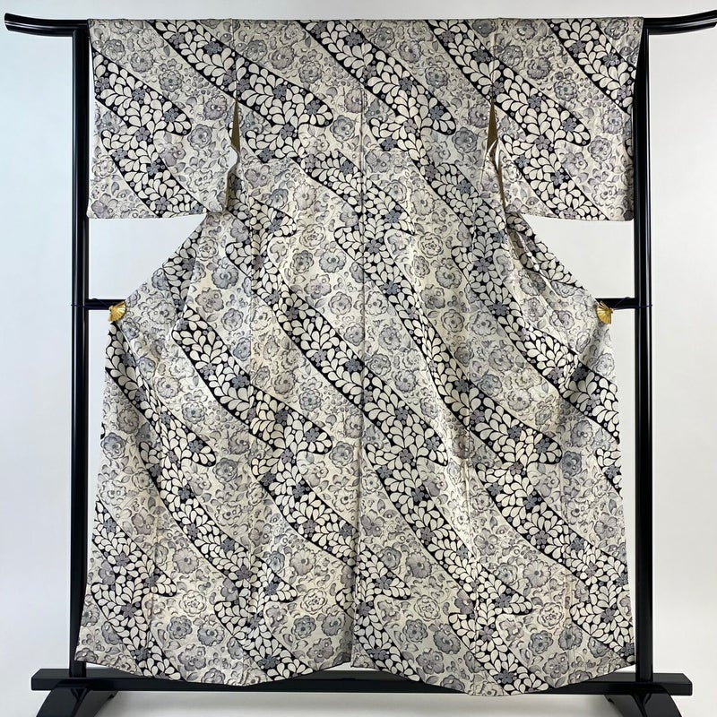 【着物ランク】優品 【素材】正絹 【身丈】約157cm 【裄丈】約64cm 【袖丈】約48.5cm 【袖幅】約33.5cm 【前幅】約24cm 【後幅】約30cm 【サイズ】M 【着物仕立て】袷 【着用時期】10~5月 【状態ランク】ランクB 【着物着用シーン】気軽なパーティー、観劇、食事会、正月、気軽なお茶会、街着