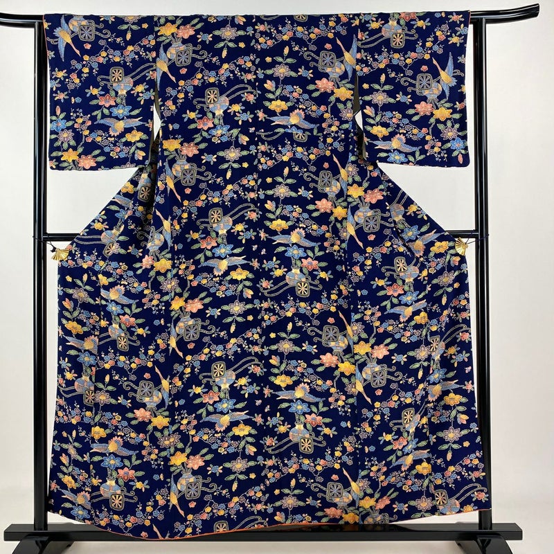 【着物ランク】優品 【素材】正絹 【身丈】約156.5cm 【裄丈】約63cm 【袖丈】約48.5cm 【袖幅】約32.5cm 【前幅】約25cm 【後幅】約29.5cm 【サイズ】S 【着物仕立て】袷 【着用時期】10~5月 【状態ランク】ランクB 【着物着用シーン】気軽なパーティー、観劇、食事会、正月、気軽なお茶会、街着