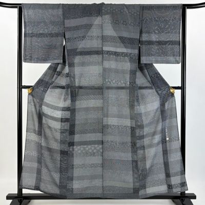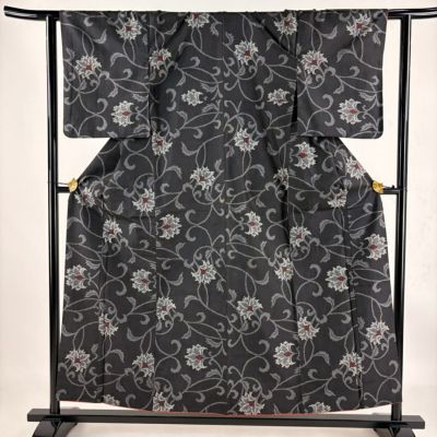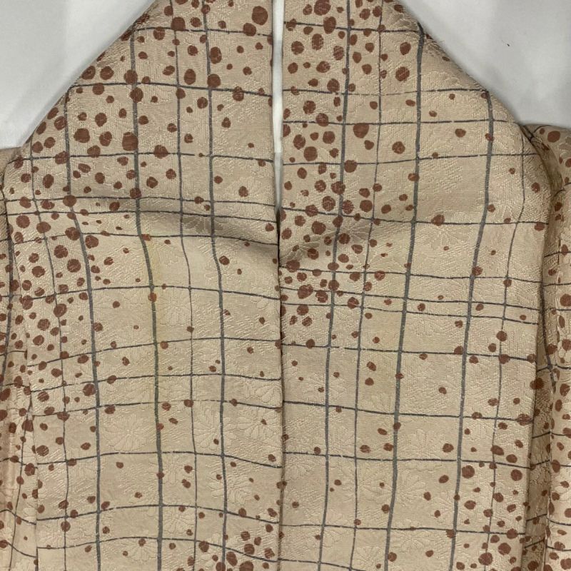 【着物ランク】名品 【素材】正絹 【身丈】約157.5cm 【裄丈】約65.5cm 【袖丈】約48.5cm 【袖幅】約33.5cm 【前幅】約25cm 【後幅】約29.5cm 【サイズ】M 【着物仕立て】袷 【着用時期】10~5月 【状態ランク】ランクB 【着物着用シーン】気軽なパーティー、観劇、食事会、正月、気軽なお茶会、街着