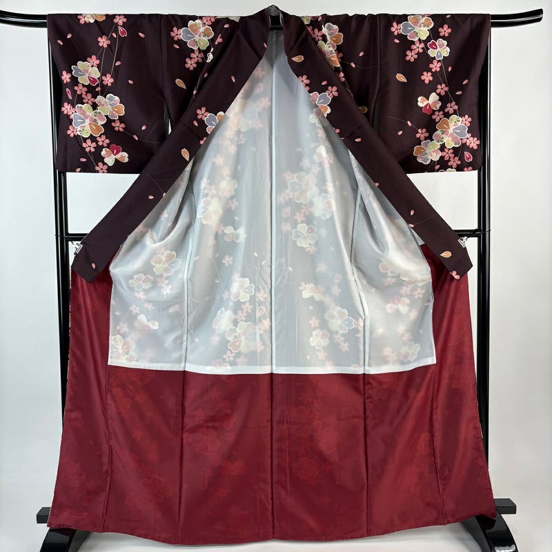 【着物ランク】優品 【素材】化繊 【身丈】約167cm 【裄丈】約68cm 【袖丈】約49cm 【袖幅】約33.5cm 【前幅】約25cm 【後幅】約30.5cm 【サイズ】L 【着物仕立て】袷 【着用時期】10~5月 【状態ランク】ランクA 【着物着用シーン】気軽なパーティー、観劇、食事会、正月、気軽なお茶会、街着