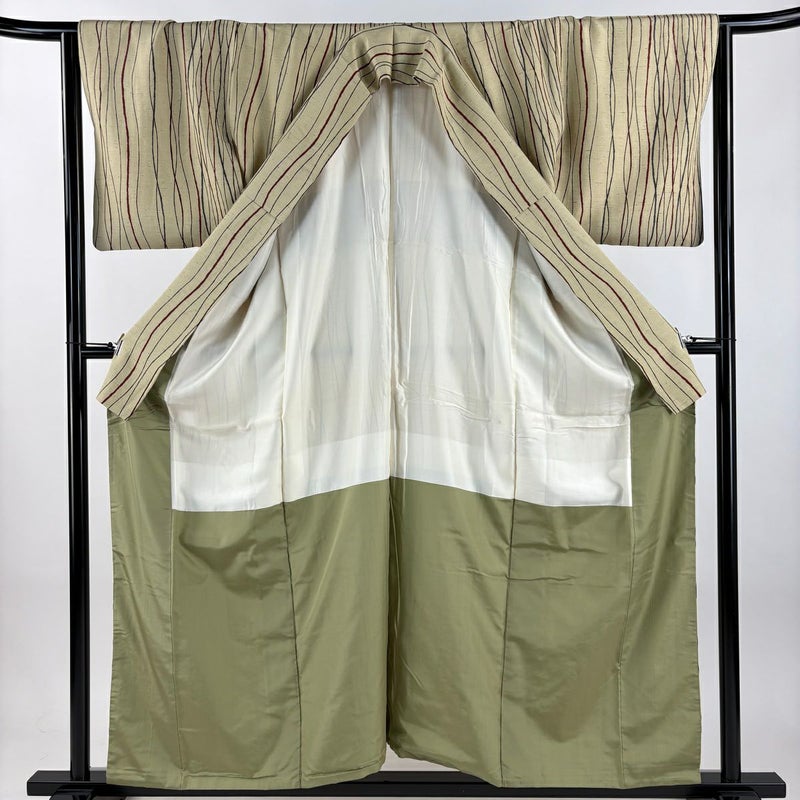 「志毛引き染め」で有名な工房手染め屋「吉兵衛」の作品でございます。 お洒落着として楽しめる小紋でございます。 お稽古や観劇、同窓会や友人との食事会など様々なシーンで楽しめます。 身丈を+6.5cm程、現在の長さから伸ばせます。 裄丈を+3.5cm程、現在の長さから伸ばせます。 両袖口中に汚れ、衿周りに薄汚れ、表地腰周りにシワがございます。 リユース品としては目立った染み傷なく、状態の良いお品でございます。 ※なお、厳しく商品の状態確認を行っておりますが、記載の汚れ以外にも見落とし箇所がある可能性がある旨ご了承いただけますと幸いです。 沢山の商品の中からご覧いただき誠にありがとうございます。
