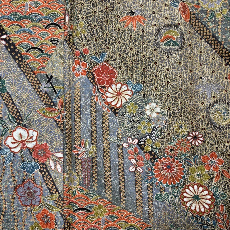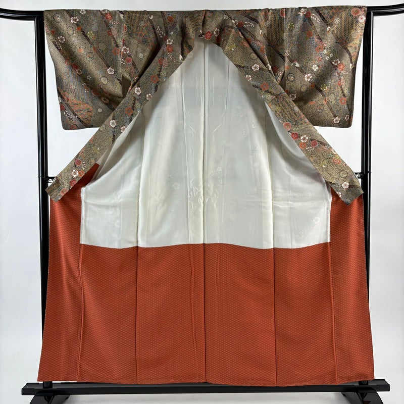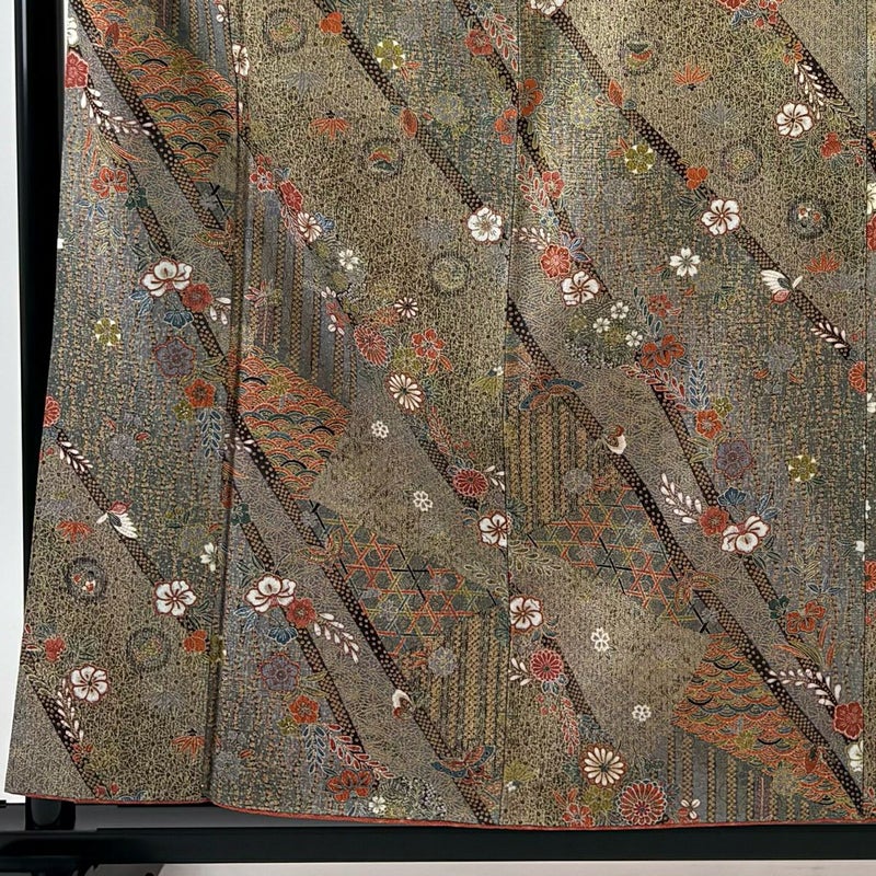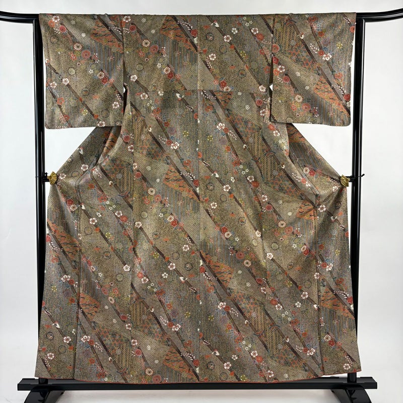 【着物ランク】名品 【素材】正絹 【身丈】約157.5cm 【裄丈】約64cm 【袖丈】約48cm 【袖幅】約33cm 【前幅】約25cm 【後幅】約33cm 【サイズ】M 【着物仕立て】袷 【着用時期】10~5月 【状態ランク】ランクA 【着物着用シーン】気軽なパーティー、観劇、食事会、正月、気軽なお茶会、街着