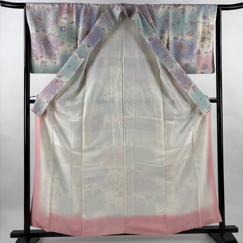 【着物ランク】優品 【素材】正絹 【身丈】約159cm 【裄丈】約65cm 【袖丈】約48cm 【袖幅】約33.5cm 【前幅】約22cm 【後幅】約29cm 【サイズ】M 【着物仕立て】袷 【着用時期】10~5月 【状態ランク】ランクA 【着物着用シーン】気軽なパーティー、観劇、食事会、正月、気軽なお茶会、街着