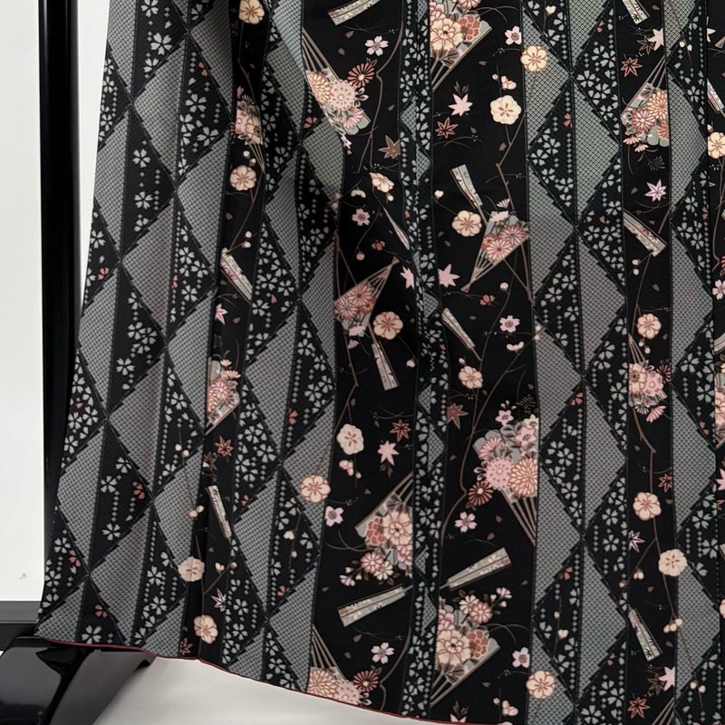 【着物ランク】優品 【素材】化繊 【身丈】約165.5cm 【裄丈】約68cm 【袖丈】約49cm 【袖幅】約34cm 【前幅】約24.5cm 【後幅】約30cm 【サイズ】L 【着物仕立て】袷 【着用時期】10~5月 【状態ランク】ランクA 【着物着用シーン】気軽なパーティー、観劇、食事会、正月、気軽なお茶会、街着