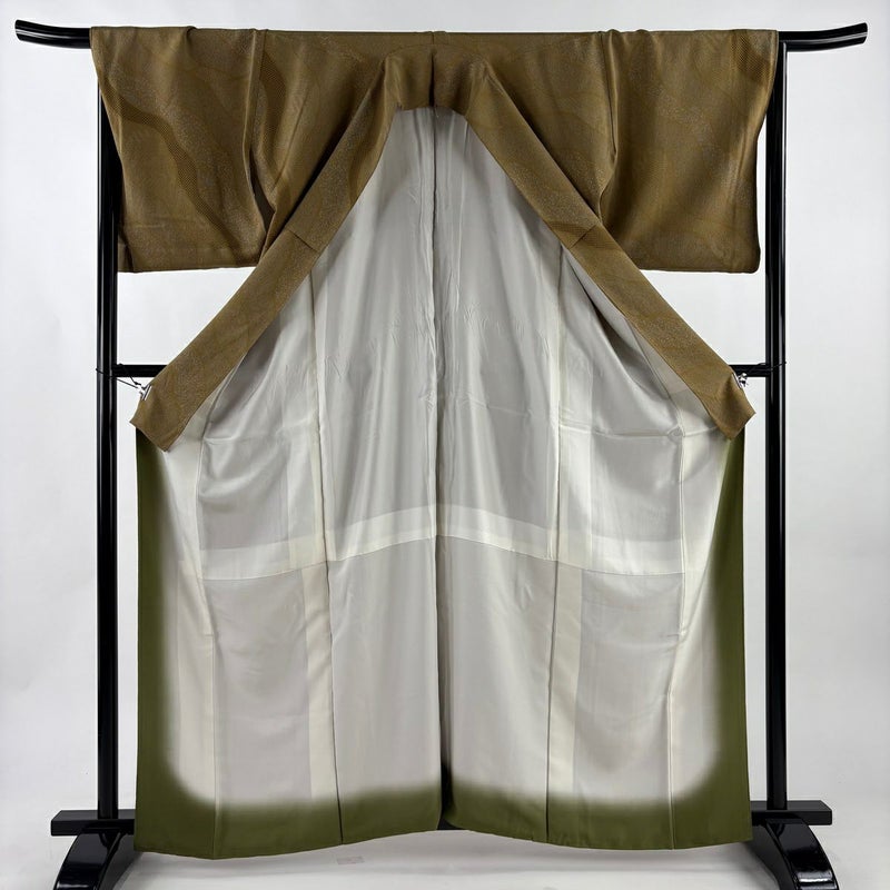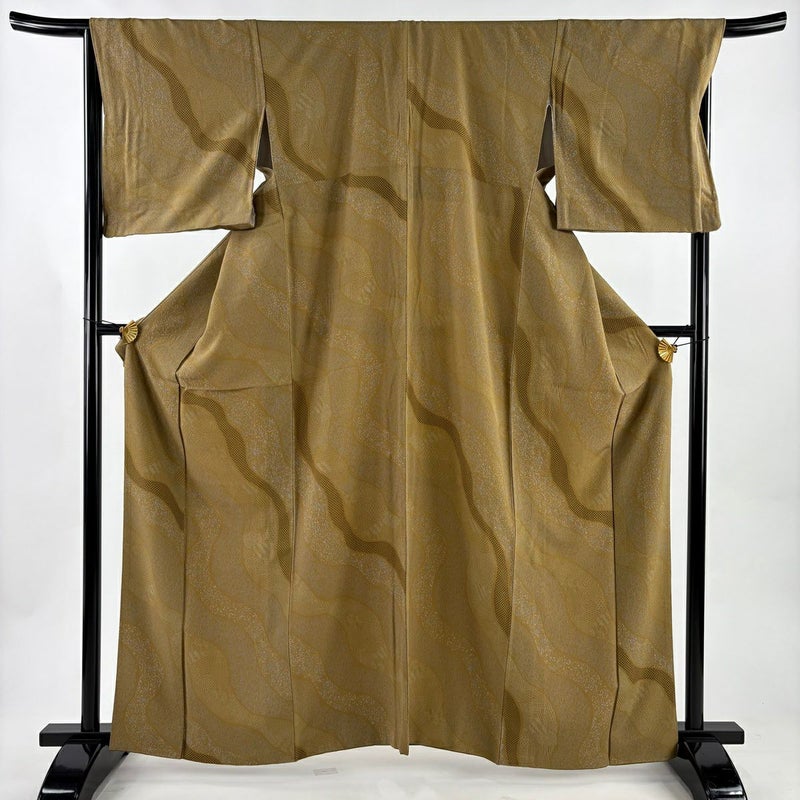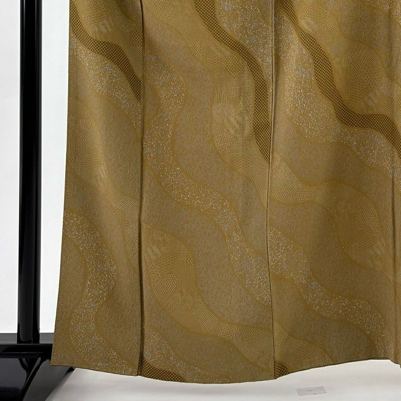 【着物ランク】優品 【素材】正絹 【身丈】約162cm 【裄丈】約68cm 【袖丈】約48.5cm 【袖幅】約35.5cm 【前幅】約25cm 【後幅】約30cm 【サイズ】L 【着物仕立て】袷 【着用時期】10~5月 【状態ランク】ランクB 【着物着用シーン】気軽なパーティー、観劇、食事会、正月、気軽なお茶会、街着