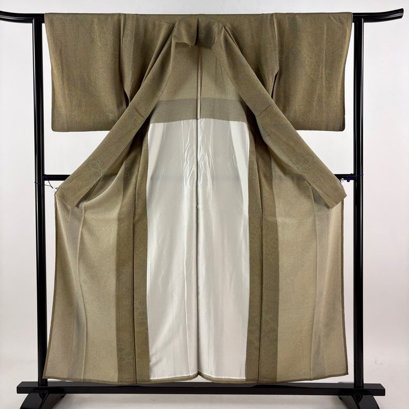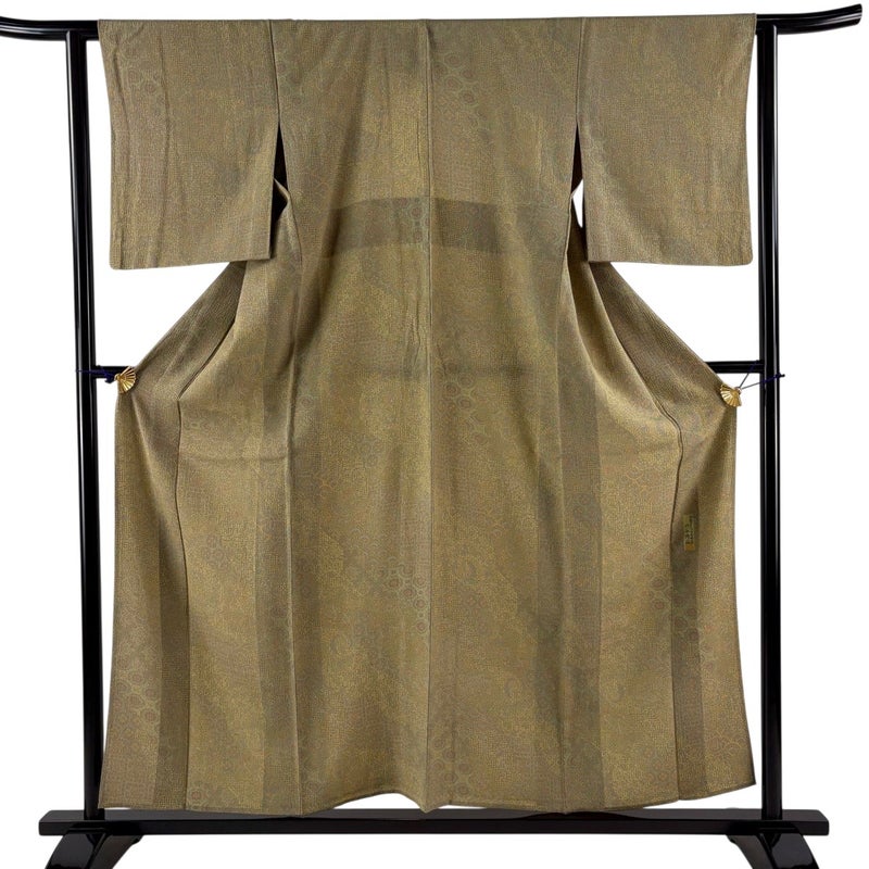 伊勢型紙錐彫の「六谷博臣」の作品でございます。 「錐彫り」は半円形の刃先の小刀を用い丸い小さな穴を無数にあけて、文様をつくり出します。 お洒落着として楽しめる小紋でございます。 お稽古や観劇、同窓会や友人との食事会など様々なシーンで楽しめます。 ※身丈・裄丈の縫込みの長さは測っておりません。 リユース品としては目立った染み傷なく、状態の良いお品でございます。 ※なお、厳しく商品の状態確認を行っておりますが、記載の汚れ以外にも見落とし箇所がある可能性がある旨ご了承いただけますと幸いです。 沢山の商品の中からご覧いただき誠にありがとうございます。