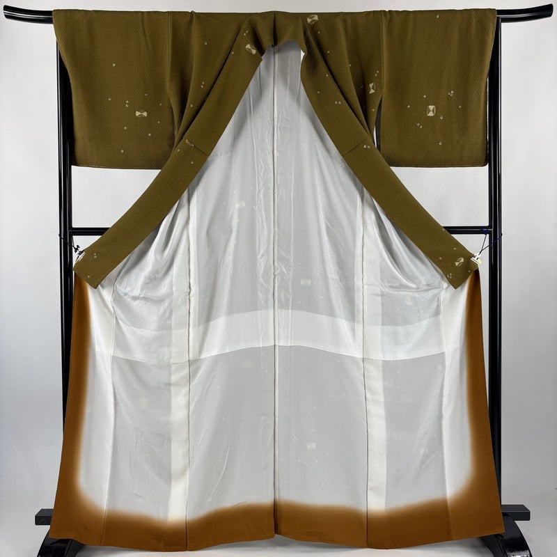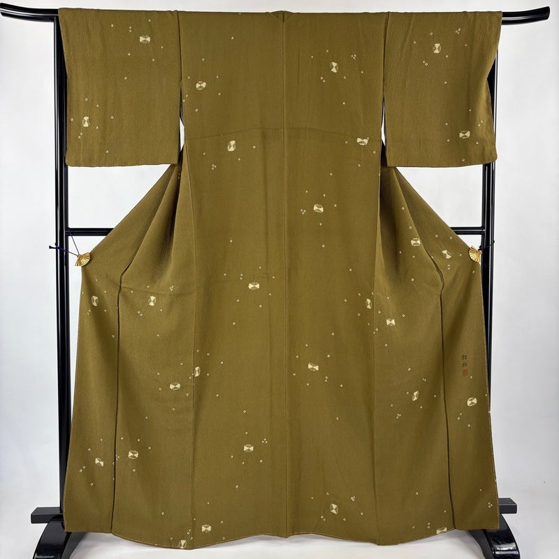 【小紋】 茶系 茶緑色 秀品 A 約160cm~約169cm 裄丈67cm-68cm (L)size 袖丈48cm 7990-9980 美品 二万以下