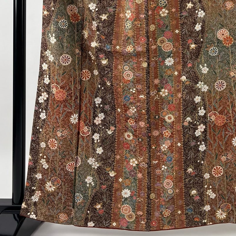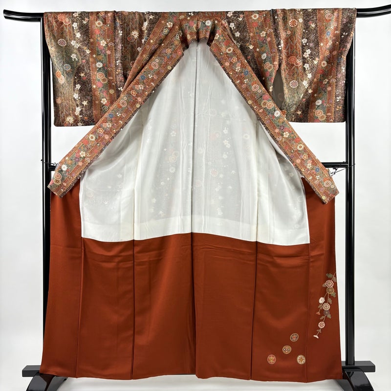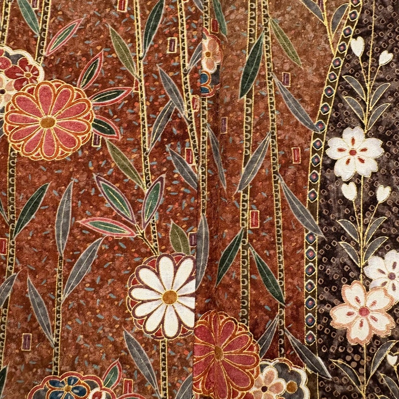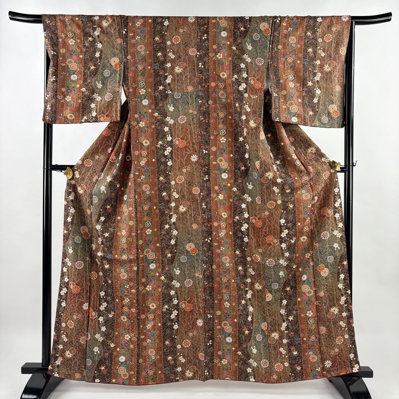 【着物ランク】秀品 【素材】正絹 【身丈】約163cm 【裄丈】約66cm 【袖丈】約49.5cm 【袖幅】約34cm 【前幅】約24cm 【後幅】約30cm 【サイズ】M 【着物仕立て】袷 【着用時期】10~5月 【状態ランク】ランクA 【着物着用シーン】気軽なパーティー、観劇、食事会、正月、気軽なお茶会、街着