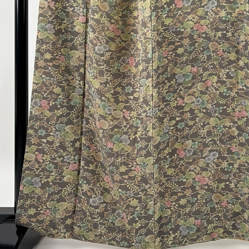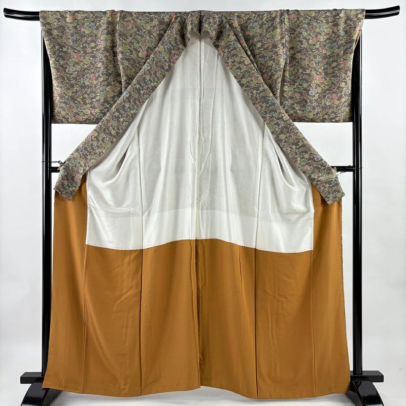 【着物ランク】優品 【素材】正絹 【身丈】約163.5cm 【裄丈】約68cm 【袖丈】約48cm 【袖幅】約34cm 【前幅】約25cm 【後幅】約31cm 【サイズ】L 【着物仕立て】袷 【着用時期】10~5月 【状態ランク】ランクB 【着物着用シーン】気軽なパーティー、観劇、食事会、正月、気軽なお茶会、街着