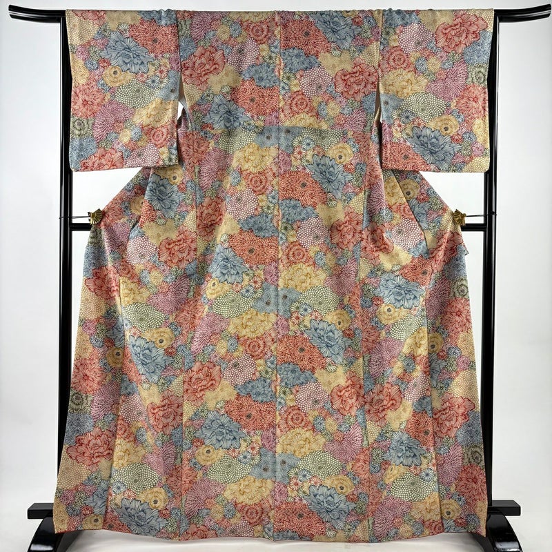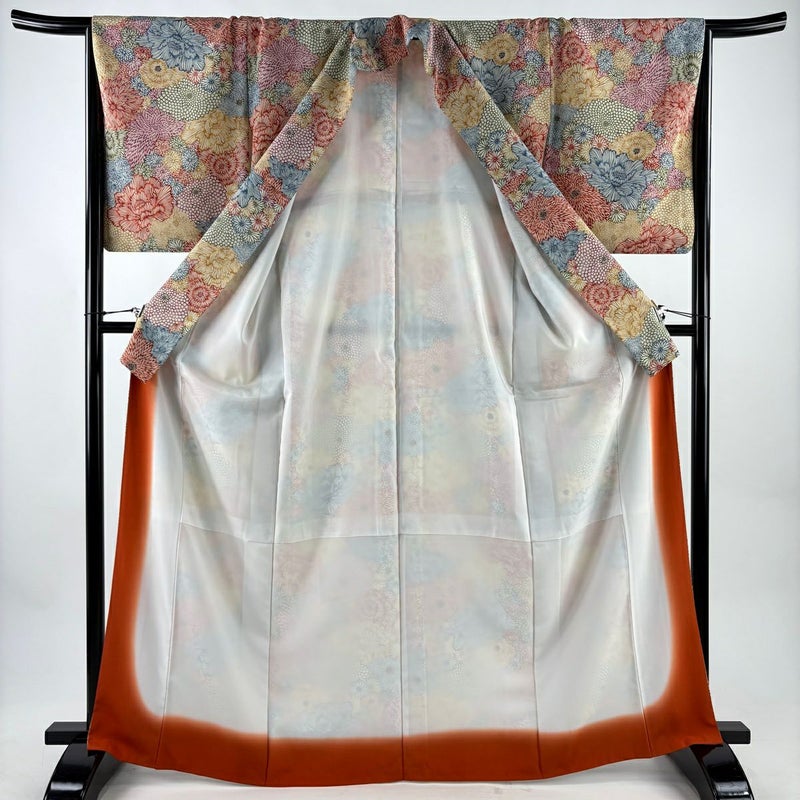 【着物ランク】秀品 【素材】化繊 【身丈】約167cm 【裄丈】約65.5cm 【袖丈】約50.5cm 【袖幅】約34cm 【前幅】約24cm 【後幅】約30cm 【サイズ】M 【着物仕立て】袷 【着用時期】10~5月 【状態ランク】ランクA 【着物着用シーン】気軽なパーティー、観劇、食事会、正月、気軽なお茶会、街着