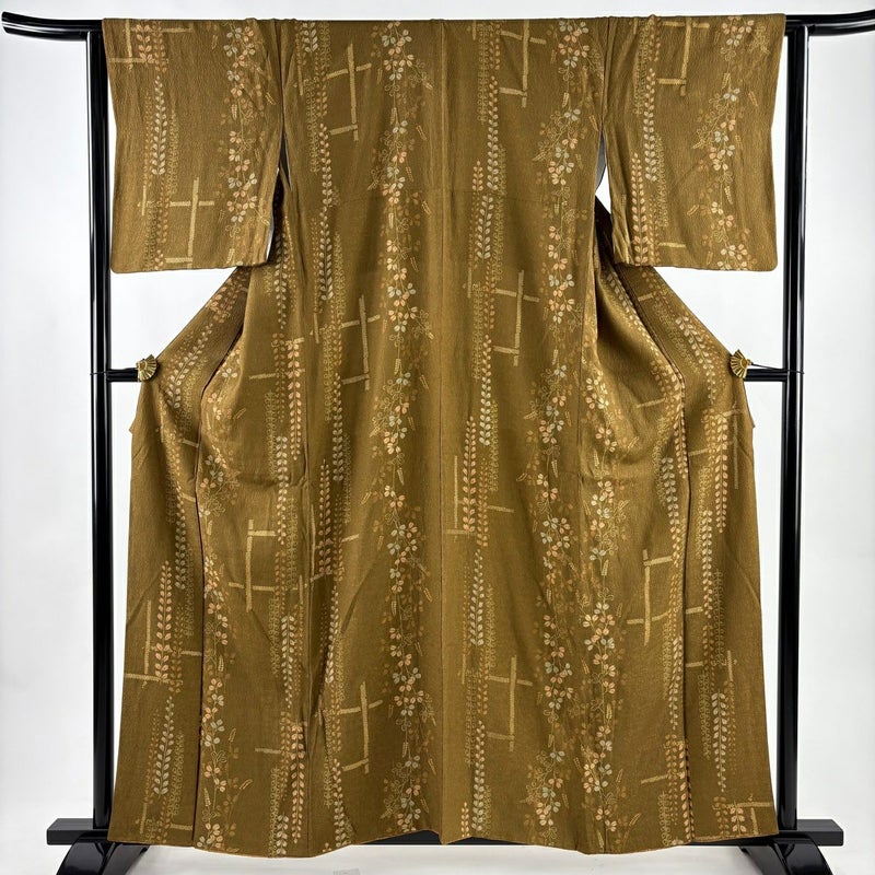【着物ランク】秀品 【素材】正絹 【身丈】約158cm 【裄丈】約63.5cm 【袖丈】約48cm 【袖幅】約31.5cm 【前幅】約23cm 【後幅】約30.5cm 【サイズ】S 【着物仕立て】袷 【着用時期】10~5月 【状態ランク】ランクC 【着物着用シーン】気軽なパーティー、観劇、食事会、正月、気軽なお茶会、街着