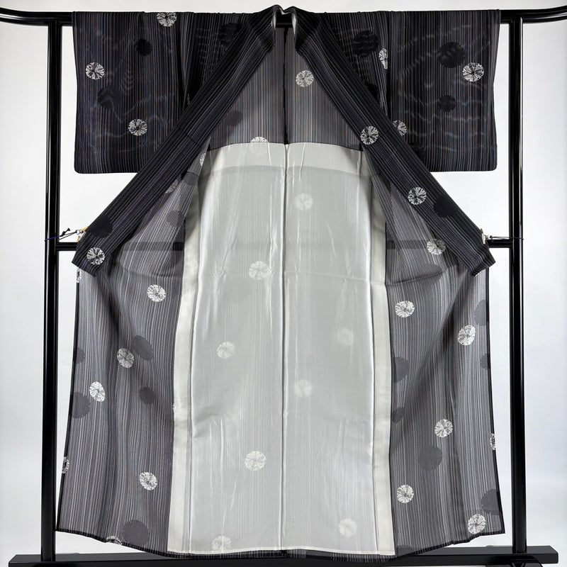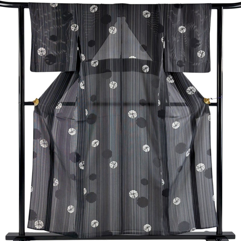【着物ランク】名品 【素材】正絹 【身丈】約155cm 【裄丈】約60.5cm 【袖丈】約47cm 【袖幅】約33cm 【前幅】約26cm 【後幅】約27cm 【サイズ】S 【着物仕立て】薄物 【着用時期】7~8月 【状態ランク】ランクA 【着物着用シーン】気軽なパーティー、観劇、食事会、正月、気軽なお茶会、街着