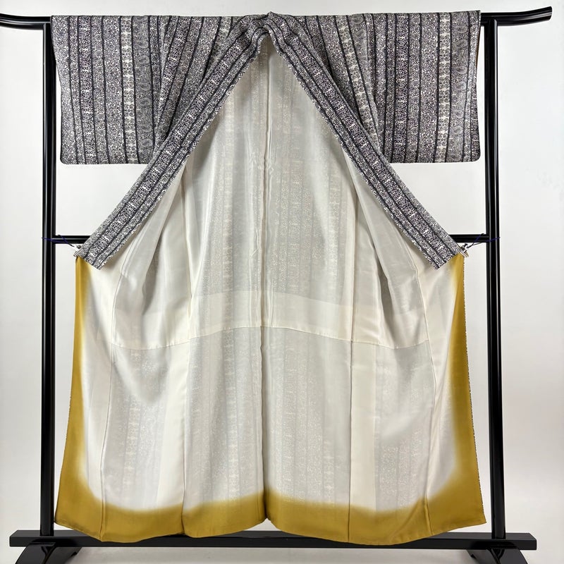 【着物ランク】秀品 【素材】正絹 【身丈】約156.5cm 【裄丈】約64cm 【袖丈】約45.5cm 【袖幅】約33cm 【前幅】約24.5cm 【後幅】約28.5cm 【サイズ】M 【着物仕立て】袷 【着用時期】10~5月 【状態ランク】ランクB 【着物着用シーン】気軽なパーティー、観劇、食事会、正月、気軽なお茶会、街着