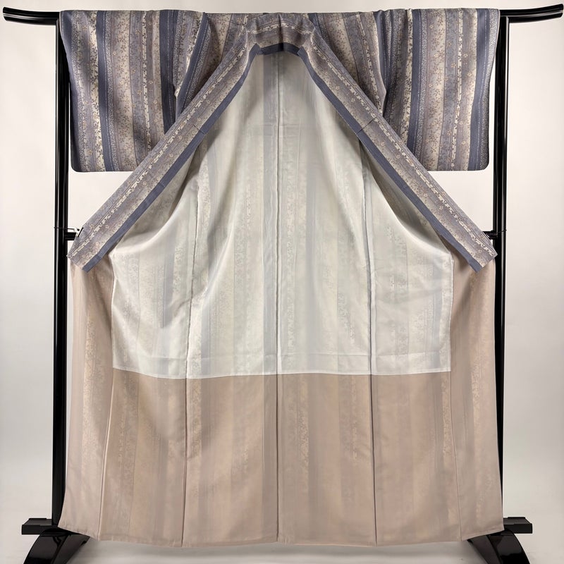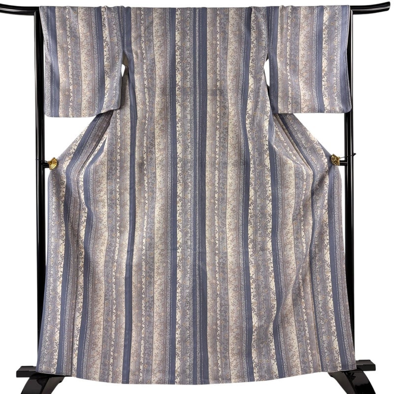 【着物ランク】優品 【素材】化繊 【身丈】約164cm 【裄丈】約66cm 【袖丈】約48cm 【袖幅】約33.5cm 【前幅】約24cm 【後幅】約29cm 【サイズ】M 【着物仕立て】袷 【着用時期】10~5月 【状態ランク】ランクB 【着物着用シーン】気軽なパーティー、観劇、食事会、正月、気軽なお茶会、街着