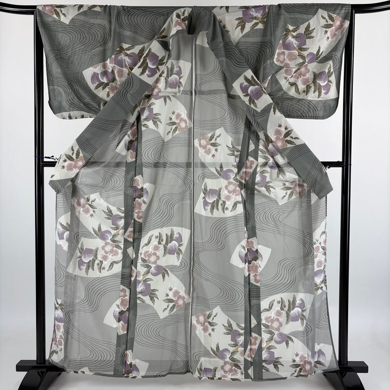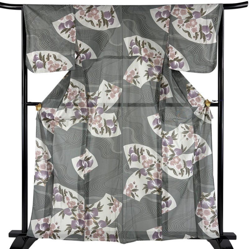 【着物ランク】優品 【素材】化繊 【身丈】約162.5cm 【裄丈】約66cm 【袖丈】約49.5cm 【袖幅】約33.5cm 【前幅】約24.5cm 【後幅】約29.5cm 【サイズ】M 【着物仕立て】薄物 【着用時期】7~8月 【状態ランク】ランクB 【着物着用シーン】気軽なパーティー、観劇、食事会、正月、気軽なお茶会、街着