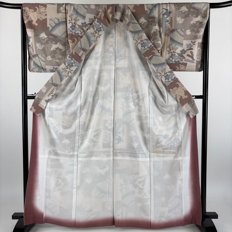 【着物ランク】優品 【素材】化繊 【身丈】約166cm 【裄丈】約66cm 【袖丈】約49.5cm 【袖幅】約34cm 【前幅】約24.5cm 【後幅】約29.5cm 【サイズ】M 【着物仕立て】袷 【着用時期】10~5月 【状態ランク】ランクA 【着物着用シーン】気軽なパーティー、観劇、食事会、正月、気軽なお茶会、街着