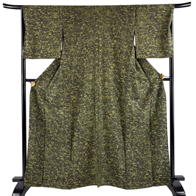【着物ランク】秀品 【素材】正絹 【身丈】約164.5cm 【裄丈】約67.5cm 【袖丈】約49cm 【袖幅】約34cm 【前幅】約25cm 【後幅】約30cm 【サイズ】L 【着物仕立て】単衣 【着用時期】6/9月 【状態ランク】ランクA 【着物着用シーン】気軽なパーティー、観劇、食事会、正月、気軽なお茶会、街着