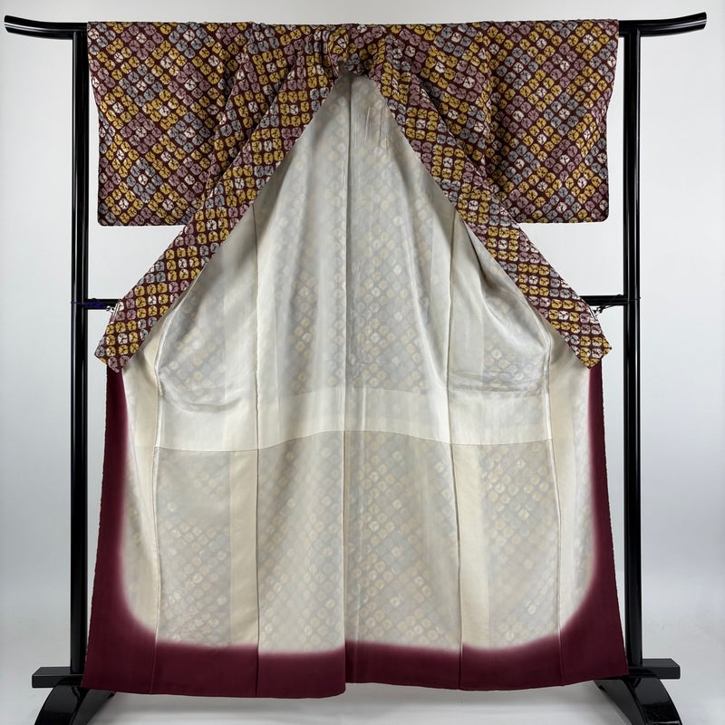 【着物ランク】秀品 【素材】正絹 【身丈】約161cm 【裄丈】約64cm 【袖丈】約48cm 【袖幅】約33.5cm 【前幅】約24.5cm 【後幅】約29cm 【サイズ】M 【着物仕立て】袷 【着用時期】10~5月 【状態ランク】ランクC 【着物着用シーン】気軽なパーティー、観劇、食事会、正月、気軽なお茶会、街着