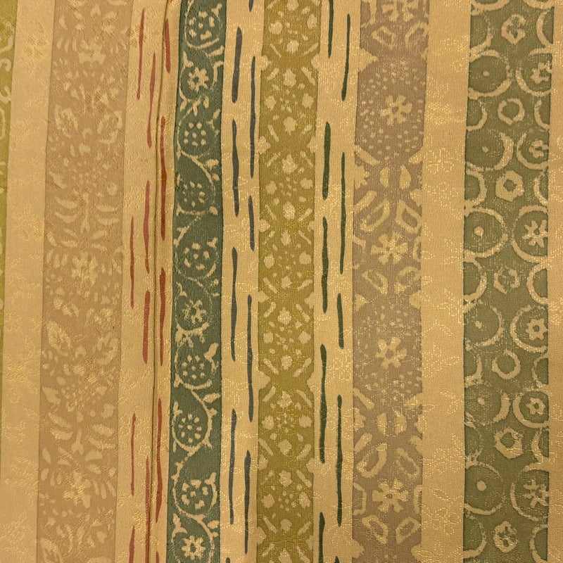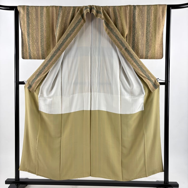 【着物ランク】秀品 【素材】正絹 【身丈】約153cm 【裄丈】約64cm 【袖丈】約46cm 【袖幅】約34cm 【前幅】約22cm 【後幅】約28.5cm 【サイズ】M 【着物仕立て】袷 【着用時期】10~5月 【状態ランク】ランクB 【着物着用シーン】気軽なパーティー、観劇、食事会、正月、気軽なお茶会、街着