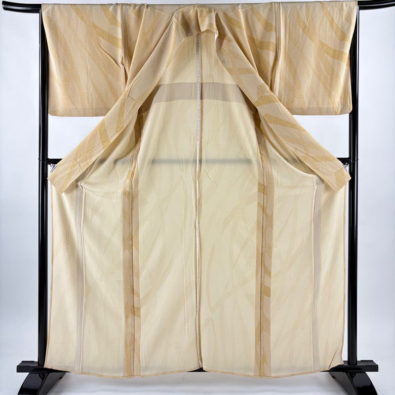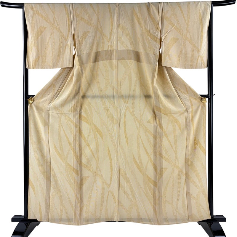 【着物ランク】秀品 【素材】正絹 【身丈】約160cm 【裄丈】約66.5cm 【袖丈】約49cm 【袖幅】約34.5cm 【前幅】約23.5cm 【後幅】約29cm 【サイズ】M 【着物仕立て】単衣 【着用時期】6/9月 【状態ランク】ランクB 【着物着用シーン】気軽なパーティー、観劇、食事会、正月、気軽なお茶会、街着