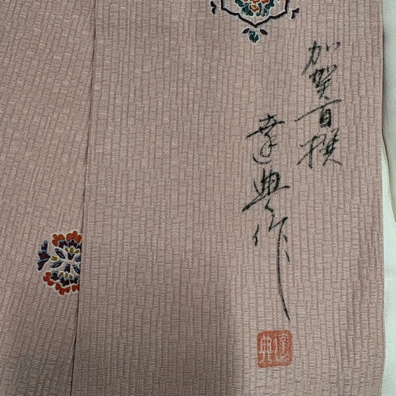 【着物ランク】秀品 【素材】正絹 【身丈】約162cm 【裄丈】約66cm 【袖丈】約48.5cm 【袖幅】約34.5cm 【前幅】約25cm 【後幅】約29cm 【サイズ】M 【着物仕立て】袷 【着用時期】10~5月 【状態ランク】ランクC 【着物着用シーン】気軽なパーティー、観劇、食事会、正月、気軽なお茶会、街着