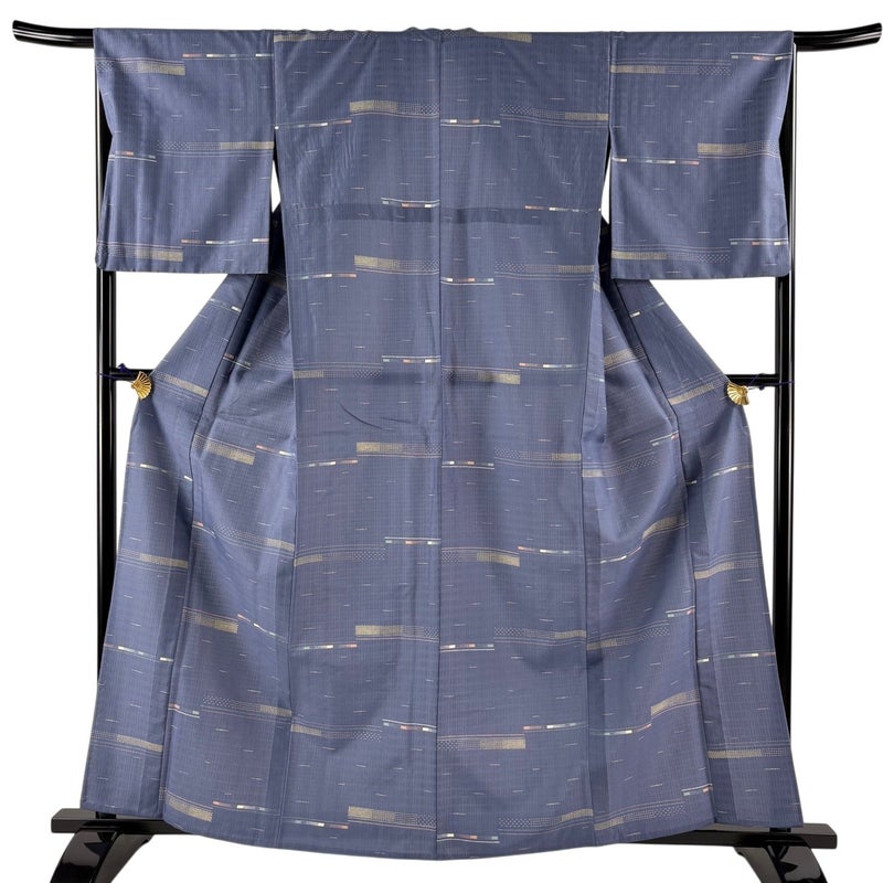 【着物ランク】秀品 【素材】化繊 【身丈】約160.5cm 【裄丈】約66cm 【袖丈】約49cm 【袖幅】約34cm 【前幅】約25cm 【後幅】約30.5cm 【サイズ】M 【着物仕立て】単衣 【着用時期】6/9月 【状態ランク】ランクB 【着物着用シーン】気軽なパーティー、観劇、食事会、正月、気軽なお茶会、街着