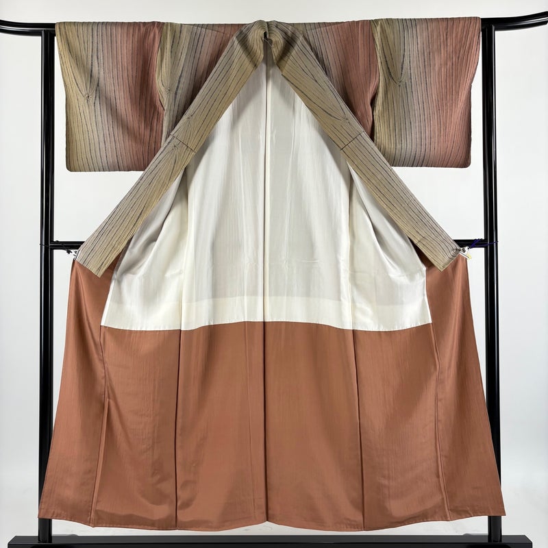 【着物ランク】秀品 【素材】正絹 【身丈】約153.5cm 【裄丈】約62cm 【袖丈】約44.5cm 【袖幅】約33.5cm 【前幅】約24.5cm 【後幅】約30cm 【サイズ】S 【着物仕立て】袷 【着用時期】10~5月 【状態ランク】ランクC 【着物着用シーン】気軽なパーティー、観劇、食事会、正月、気軽なお茶会、街着