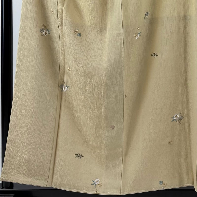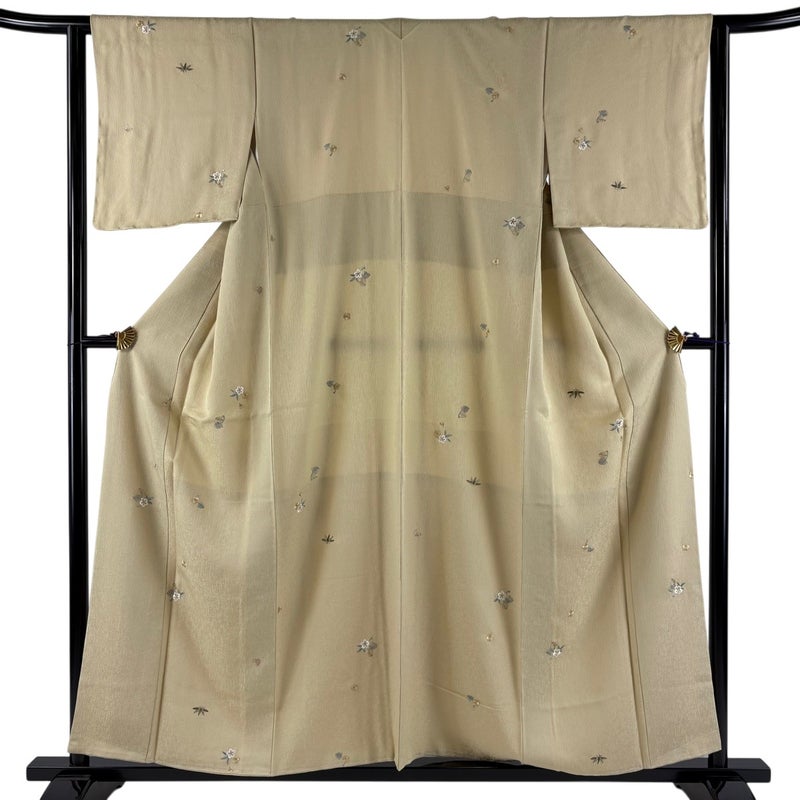 【着物ランク】秀品 【素材】正絹 【身丈】約156cm 【裄丈】約62.5cm 【袖丈】約45cm 【袖幅】約32cm 【前幅】約26cm 【後幅】約30cm 【サイズ】S 【着物仕立て】袷 【着用時期】10~5月 【状態ランク】ランクA 【着物着用シーン】気軽なパーティー、観劇、食事会、正月、気軽なお茶会、街着