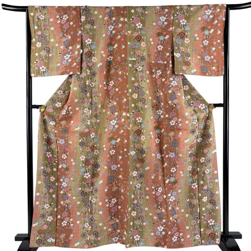 【小紋】 茶系 茶緑色 秀品 A 約160cm~約169cm 裄丈65cm (M)size 袖丈49cm 7990-9980 美品 二万以下