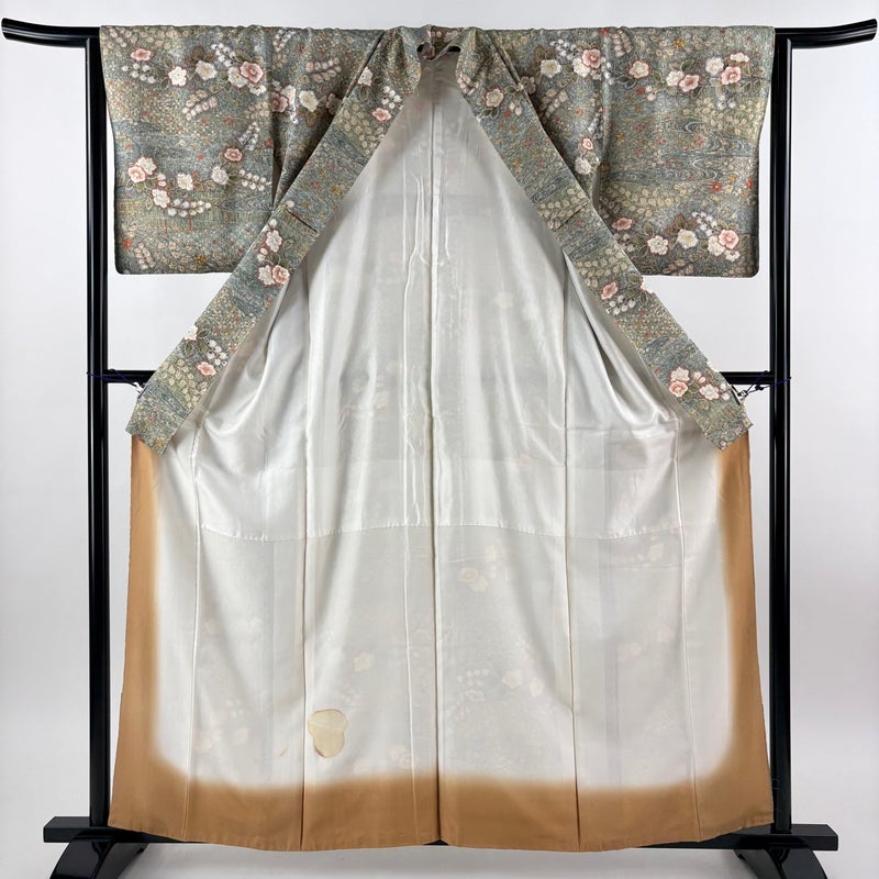 【着物ランク】秀品 【素材】正絹 【身丈】約160cm 【裄丈】約63.5cm 【袖丈】約48.5cm 【袖幅】約33.5cm 【前幅】約22.5cm 【後幅】約28cm 【サイズ】S 【着物仕立て】袷 【着用時期】10~5月 【状態ランク】ランクC 【着物着用シーン】気軽なパーティー、観劇、食事会、正月、気軽なお茶会、街着