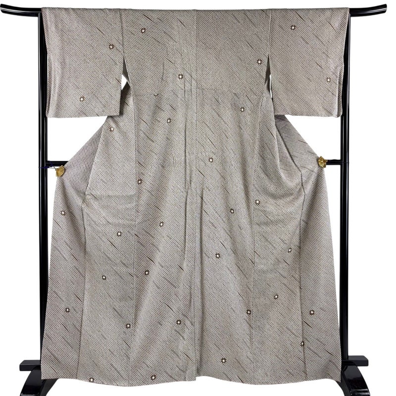 【着物ランク】秀品 【素材】正絹 【身丈】約165cm 【裄丈】約66cm 【袖丈】約49cm 【袖幅】約33.5cm 【前幅】約23.5cm 【後幅】約29.5cm 【サイズ】M 【着物仕立て】袷 【着用時期】10~5月 【状態ランク】ランクB 【着物着用シーン】気軽なパーティー、観劇、食事会、正月、気軽なお茶会、街着