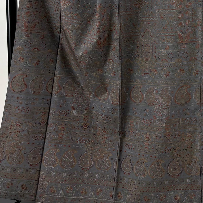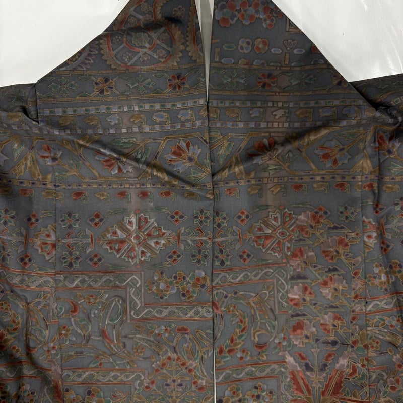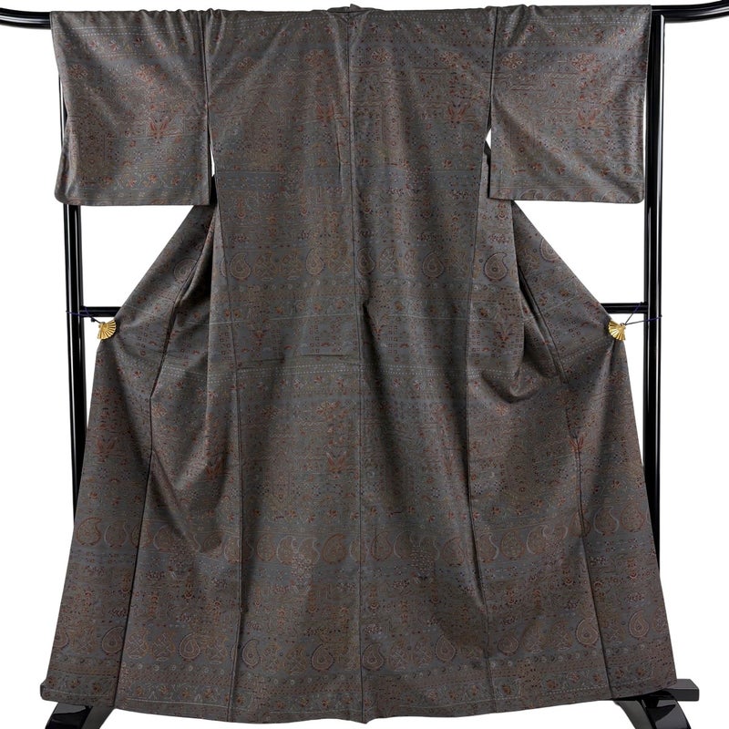 【着物ランク】秀品 【素材】正絹 【身丈】約163cm 【裄丈】約67cm 【袖丈】約45cm 【袖幅】約34cm 【前幅】約26.5cm 【後幅】約31cm 【サイズ】M 【着物仕立て】袷 【着用時期】10~5月 【状態ランク】ランクB 【着物着用シーン】気軽なパーティー、観劇、食事会、正月、気軽なお茶会、街着