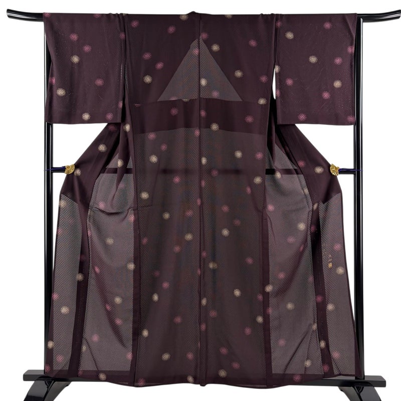 【着物ランク】秀品 【素材】正絹 【身丈】約157cm 【裄丈】約66.5cm 【袖丈】約49cm 【袖幅】約34cm 【前幅】約25cm 【後幅】約31cm 【サイズ】M 【着物仕立て】薄物 【着用時期】7~8月 【状態ランク】ランクB 【着物着用シーン】気軽なパーティー、観劇、食事会、正月、気軽なお茶会、街着