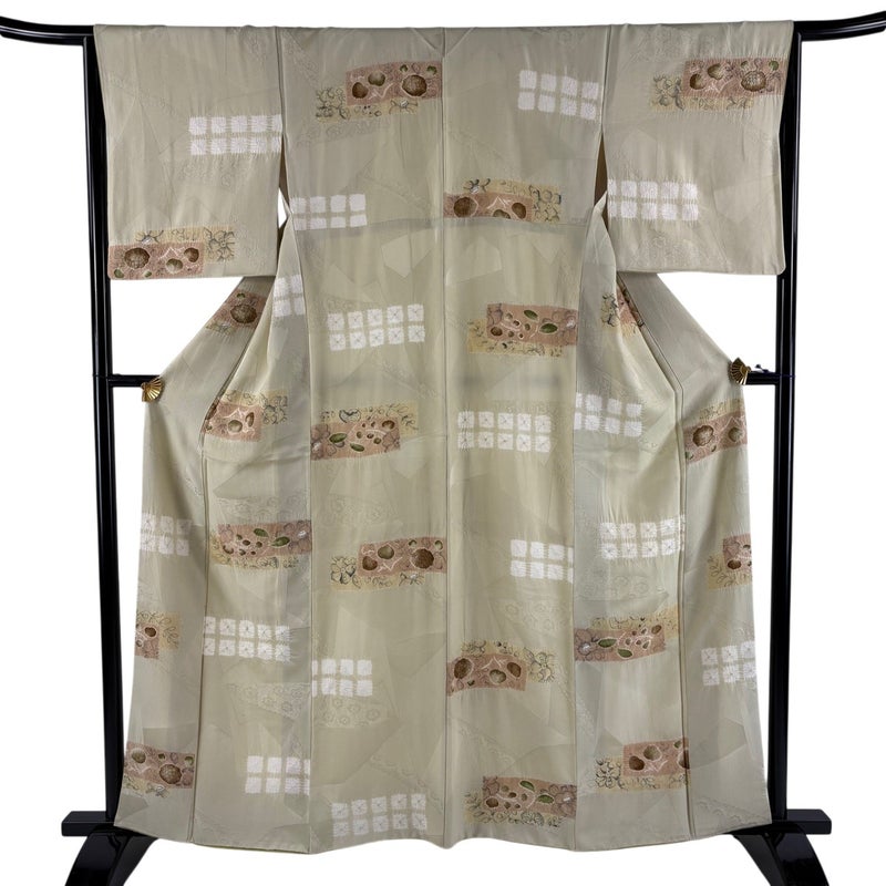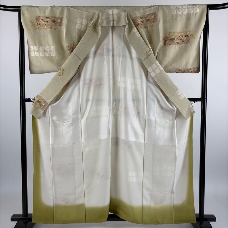 【着物ランク】秀品 【素材】正絹 【身丈】約160.5cm 【裄丈】約65cm 【袖丈】約49cm 【袖幅】約33.5cm 【前幅】約24cm 【後幅】約29cm 【サイズ】M 【着物仕立て】袷 【着用時期】10~5月 【状態ランク】ランクB 【着物着用シーン】気軽なパーティー、観劇、食事会、正月、気軽なお茶会、街着