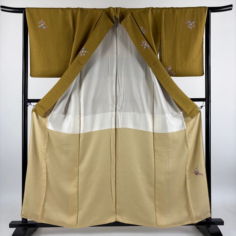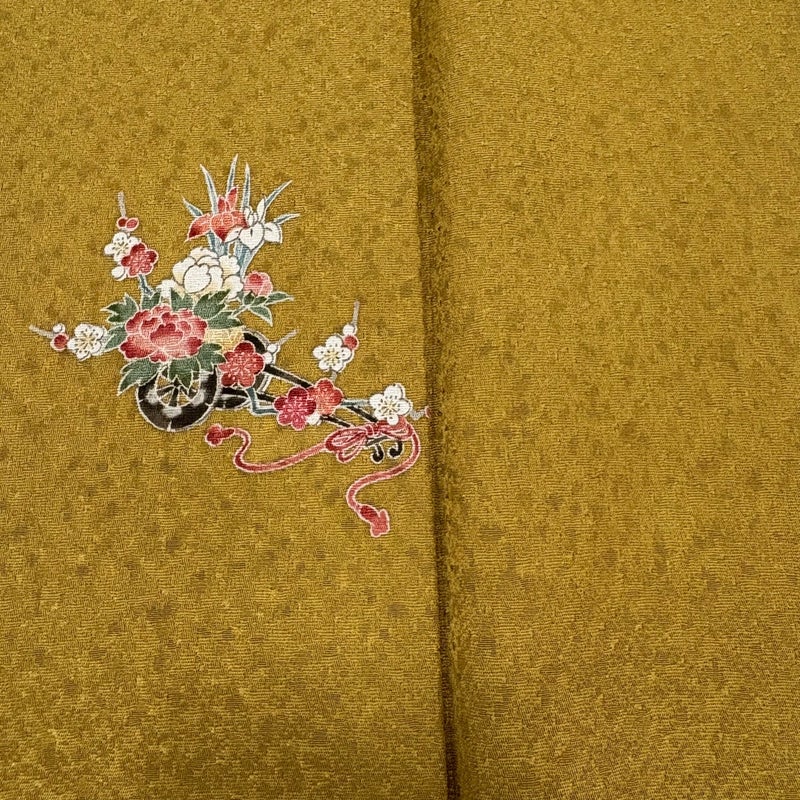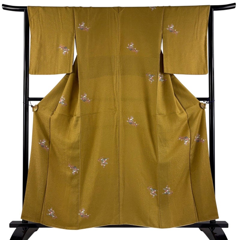 【着物ランク】秀品 【素材】正絹 【身丈】約158cm 【裄丈】約65cm 【袖丈】約51cm 【袖幅】約33cm 【前幅】約25cm 【後幅】約29.5cm 【サイズ】M 【着物仕立て】袷 【着用時期】10~5月 【状態ランク】ランクB 【着物着用シーン】気軽なパーティー、観劇、食事会、正月、気軽なお茶会、街着