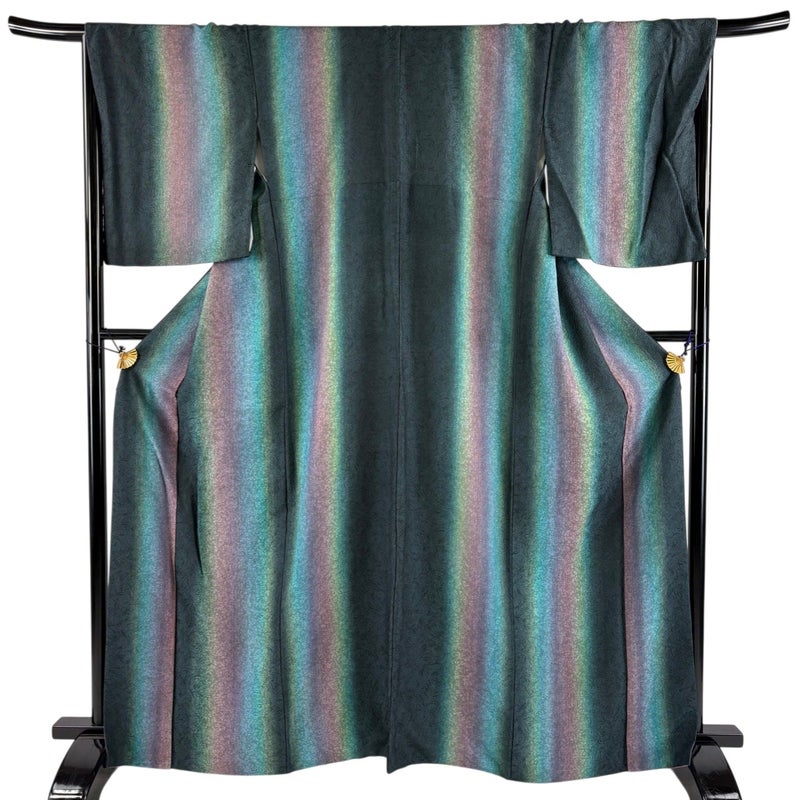 【着物ランク】秀品 【素材】正絹 【身丈】約166cm 【裄丈】約69cm 【袖丈】約53cm 【袖幅】約35.5cm 【前幅】約26cm 【後幅】約30cm 【サイズ】L 【着物仕立て】袷 【着用時期】10~5月 【状態ランク】ランクA 【着物着用シーン】気軽なパーティー、観劇、食事会、正月、気軽なお茶会、街着
