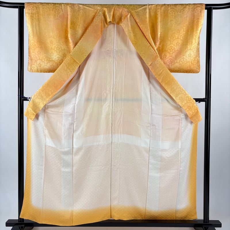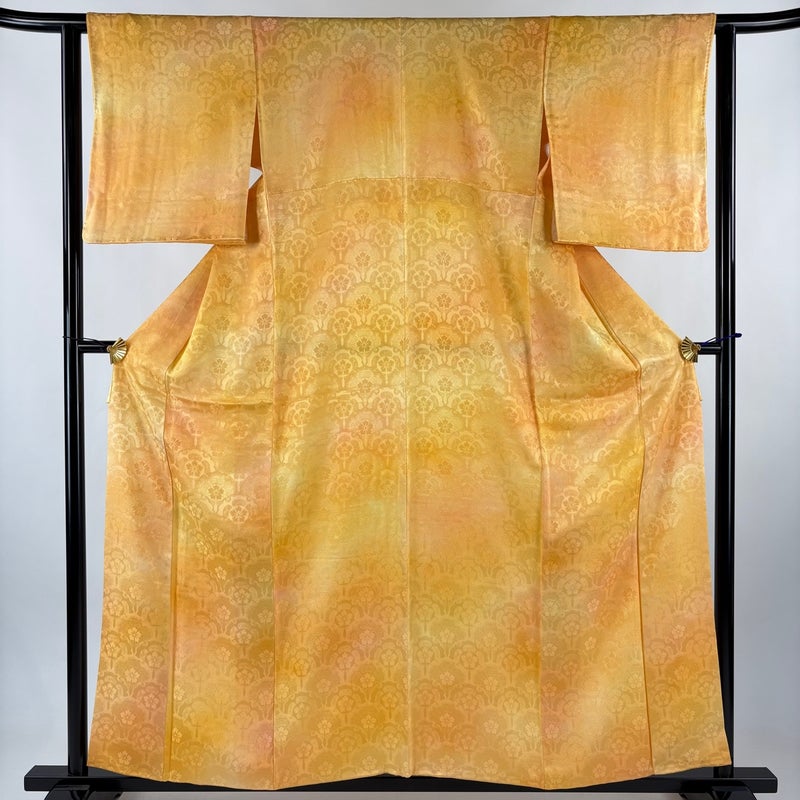 【着物ランク】優品 【素材】正絹 【身丈】約157.5cm 【裄丈】約62cm 【袖丈】約48cm 【袖幅】約33cm 【前幅】約22cm 【後幅】約27.5cm 【サイズ】S 【着物仕立て】袷 【着用時期】10~5月 【状態ランク】ランクA 【着物着用シーン】気軽なパーティー、観劇、食事会、正月、気軽なお茶会、街着