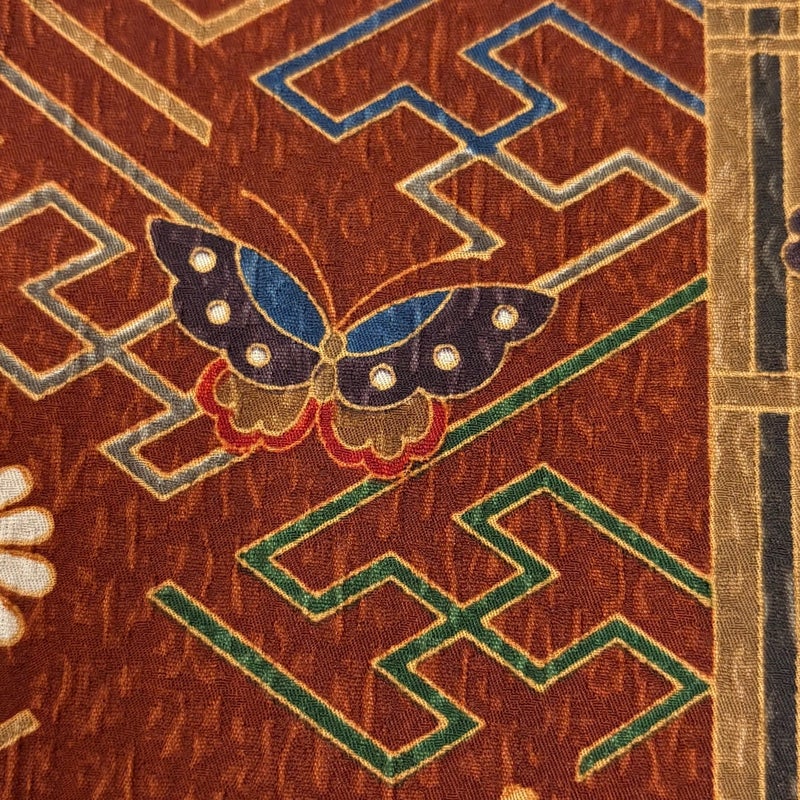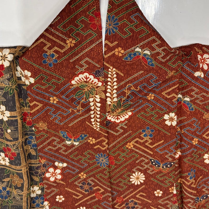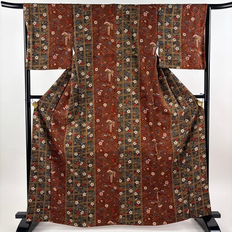 【着物ランク】秀品 【素材】正絹 【身丈】約165cm 【裄丈】約66cm 【袖丈】約49cm 【袖幅】約34.5cm 【前幅】約24cm 【後幅】約29cm 【サイズ】M 【着物仕立て】袷 【着用時期】10~5月 【状態ランク】ランクA 【着物着用シーン】気軽なパーティー、観劇、食事会、正月、気軽なお茶会、街着