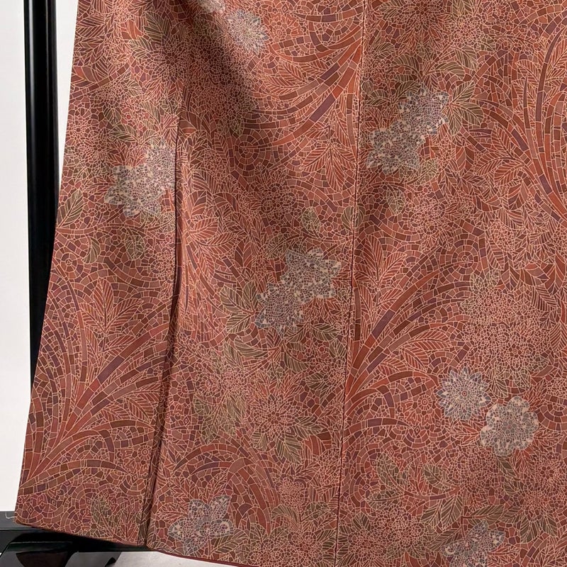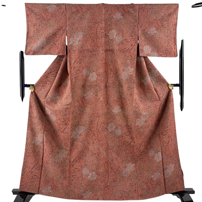 【着物ランク】優品 【素材】正絹 【身丈】約164cm 【裄丈】約62cm 【袖丈】約45cm 【袖幅】約32cm 【前幅】約24.5cm 【後幅】約30cm 【サイズ】S 【着物仕立て】袷 【着用時期】10~5月 【状態ランク】ランクA 【着物着用シーン】気軽なパーティー、観劇、食事会、正月、気軽なお茶会、街着