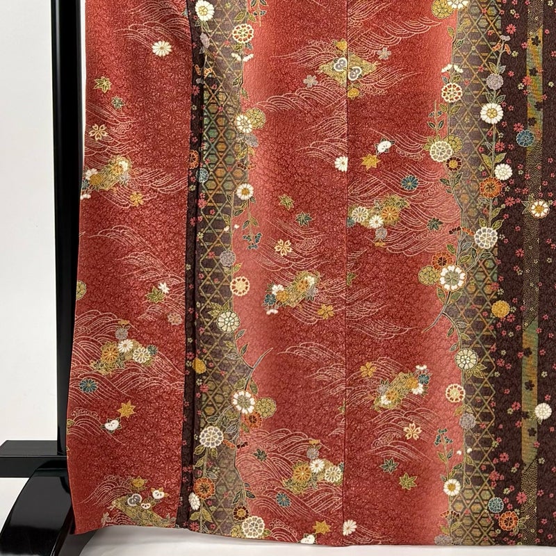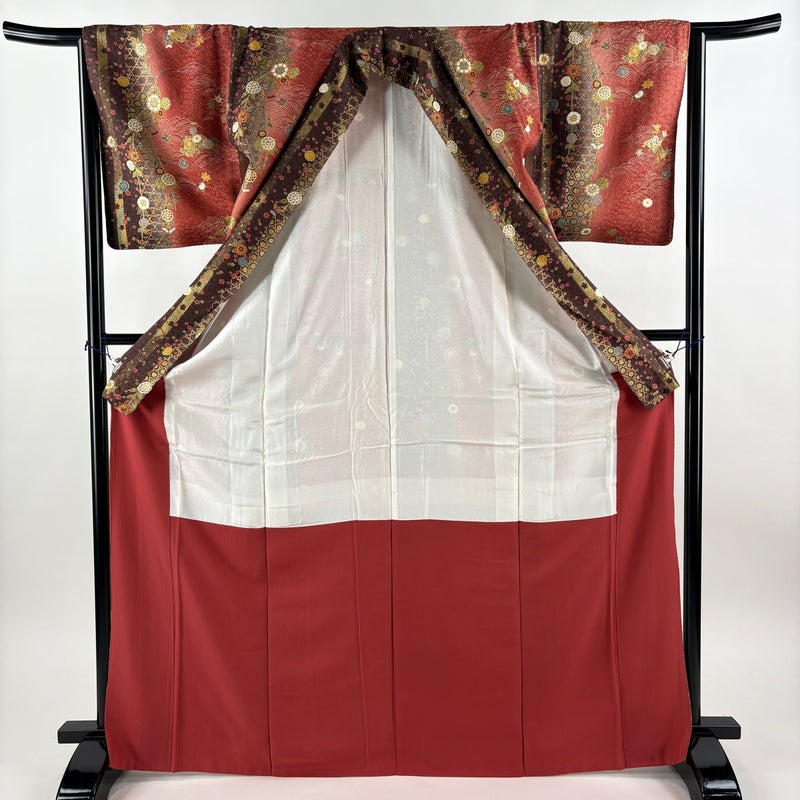 【着物ランク】秀品 【素材】正絹 【身丈】約169cm 【裄丈】約65.5cm 【袖丈】約48.5cm 【袖幅】約34cm 【前幅】約23cm 【後幅】約28.5cm 【サイズ】M 【着物仕立て】袷 【着用時期】10~5月 【状態ランク】ランクA 【着物着用シーン】気軽なパーティー、観劇、食事会、正月、気軽なお茶会、街着