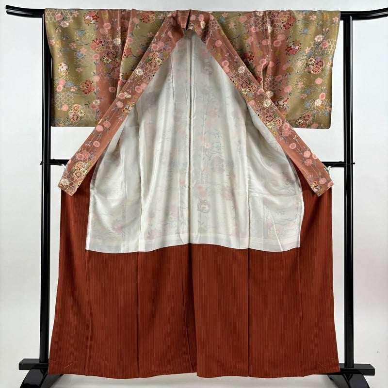 【着物ランク】秀品 【素材】正絹 【身丈】約162.5cm 【裄丈】約64.5cm 【袖丈】約52cm 【袖幅】約33cm 【前幅】約23cm 【後幅】約28.5cm 【サイズ】M 【着物仕立て】袷 【着用時期】10~5月 【帯丈2】約428cm 【帯幅2】約31.5cm 【状態ランク】ランクA 【着物着用シーン】気軽なパーティー、観劇、食事会、正月、気軽なお茶会、街着