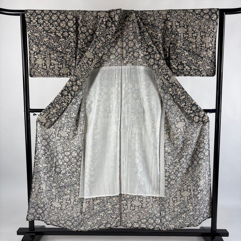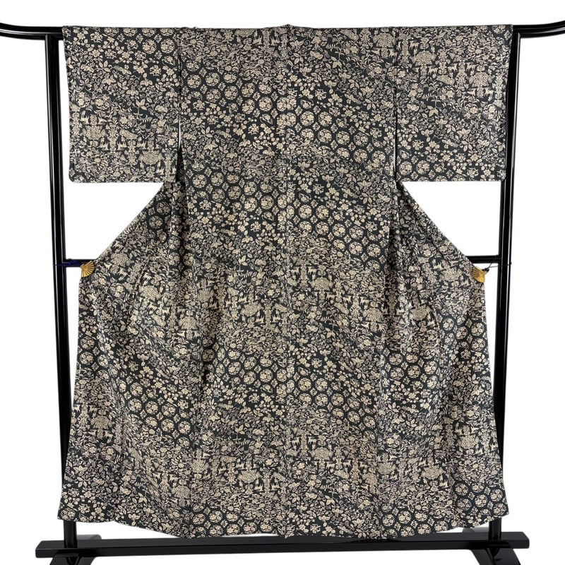 【着物ランク】秀品 【素材】正絹 【身丈】約156cm 【裄丈】約65.5cm 【袖丈】約44cm 【袖幅】約31.5cm 【前幅】約25cm 【後幅】約31cm 【サイズ】M 【着物仕立て】単衣 【着用時期】6/9月 【状態ランク】ランクA 【着物着用シーン】気軽なパーティー、観劇、食事会、正月、気軽なお茶会、街着