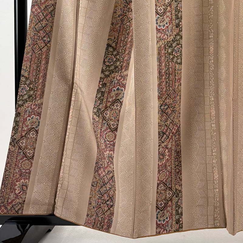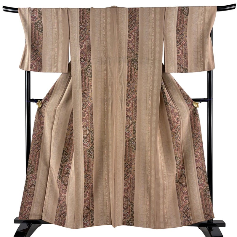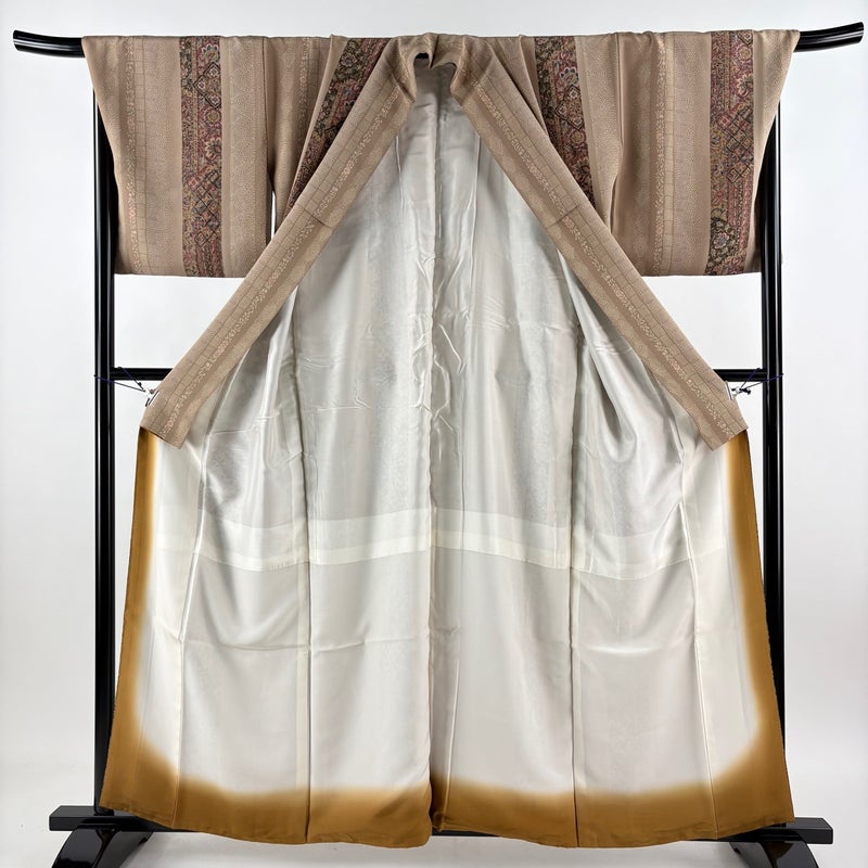 【着物ランク】秀品 【素材】正絹 【身丈】約158.5cm 【裄丈】約70cm 【袖丈】約48cm 【袖幅】約36cm 【前幅】約26.5cm 【後幅】約33cm 【サイズ】L 【着物仕立て】袷 【着用時期】10~5月 【状態ランク】ランクA 【着物着用シーン】気軽なパーティー、観劇、食事会、正月、気軽なお茶会、街着