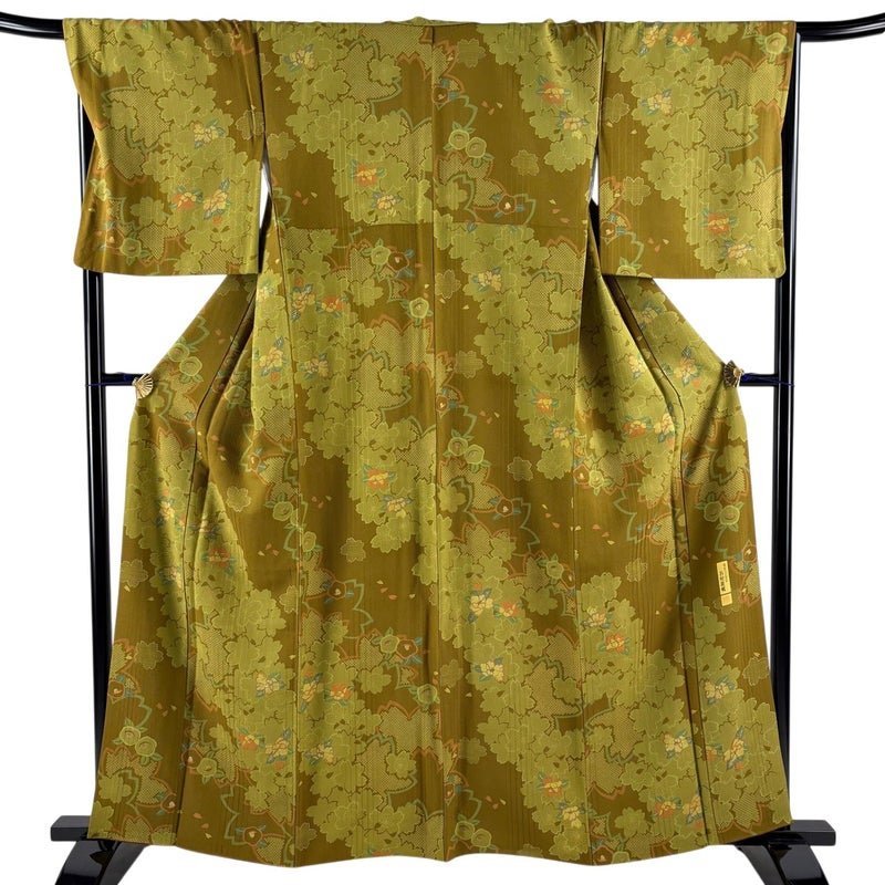 【着物ランク】秀品 【素材】正絹 【身丈】約162cm 【裄丈】約68cm 【袖丈】約49cm 【袖幅】約35cm 【前幅】約24.5cm 【後幅】約30cm 【サイズ】L 【着物仕立て】袷 【着用時期】10~5月 【状態ランク】ランクA 【着物着用シーン】気軽なパーティー、観劇、食事会、正月、気軽なお茶会、街着