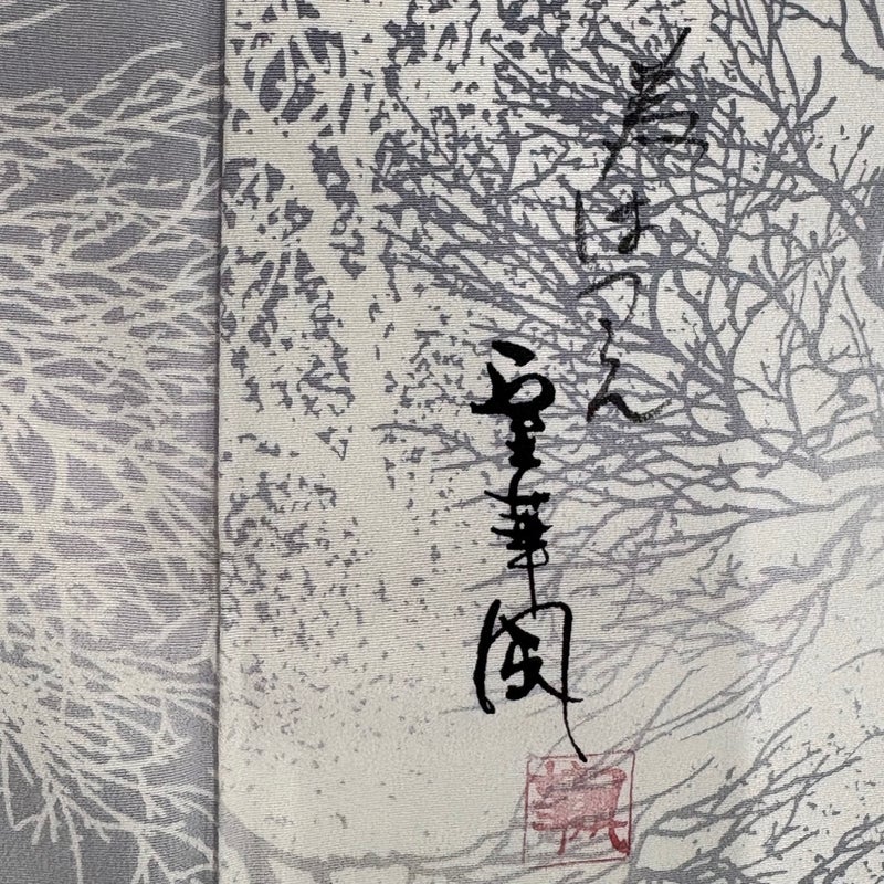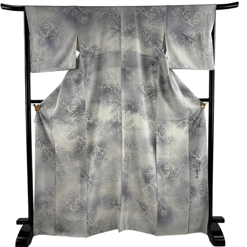 【着物ランク】秀品 【素材】正絹 【身丈】約168cm 【裄丈】約65.5cm 【袖丈】約47.5cm 【袖幅】約33.5cm 【前幅】約24.5cm 【後幅】約30cm 【サイズ】M 【着物仕立て】袷 【着用時期】10~5月 【状態ランク】ランクA 【作家名】室華風 【着物着用シーン】気軽なパーティー、観劇、食事会、正月、気軽なお茶会、街着