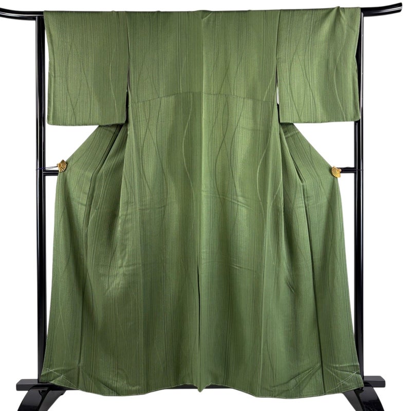 【着物ランク】秀品 【素材】正絹 【身丈】約159.5cm 【裄丈】約65cm 【袖丈】約49cm 【袖幅】約33cm 【前幅】約28.5cm 【後幅】約30.5cm 【サイズ】M 【着物仕立て】袷 【着用時期】10~5月 【状態ランク】ランクA 【着物着用シーン】気軽なパーティー、観劇、食事会、正月、気軽なお茶会、街着