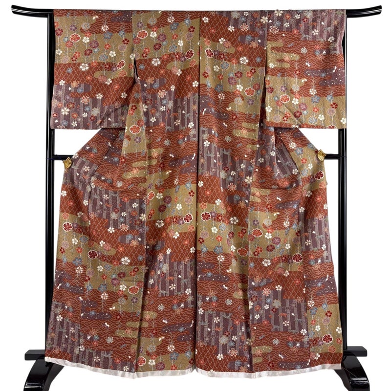 【着物ランク】秀品 【素材】正絹 【身丈】約166cm 【裄丈】約66cm 【袖丈】約56cm 【袖幅】約34.5cm 【前幅】約26cm 【後幅】約29.5cm 【サイズ】M 【着物仕立て】未仕立て 【状態ランク】ランクA 【着物着用シーン】気軽なパーティー、観劇、食事会、正月、気軽なお茶会、街着